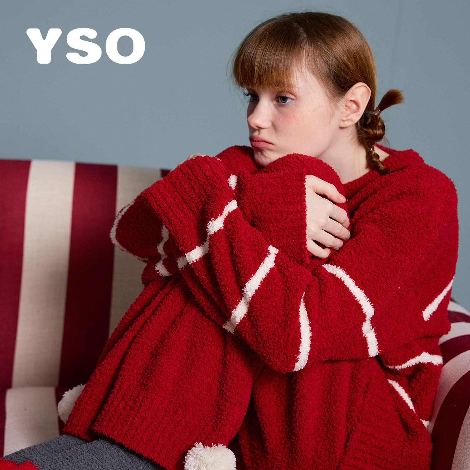 可爱半边绒睡衣女冬圣诞红色家居服卡通条纹套装 yso 酷猫系列