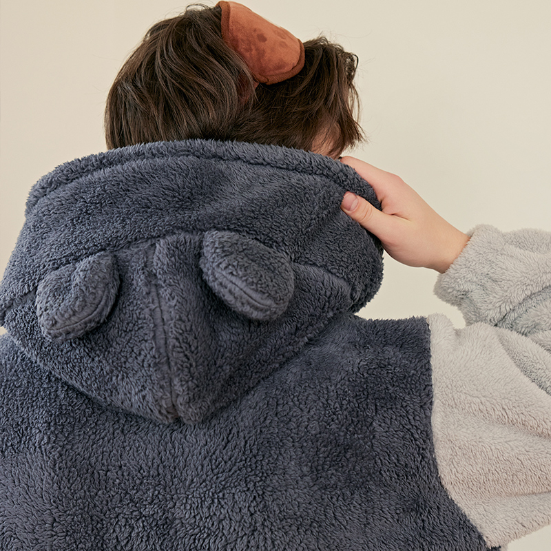 芬腾布朗熊情侣睡袍秋冬抗静电珊瑚绒连帽睡衣男女加绒加厚家居服