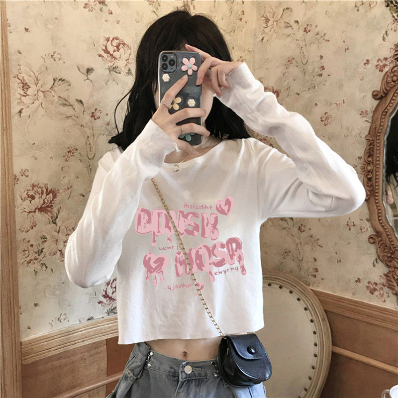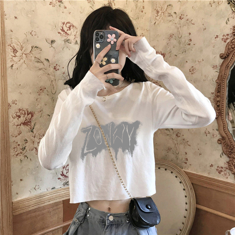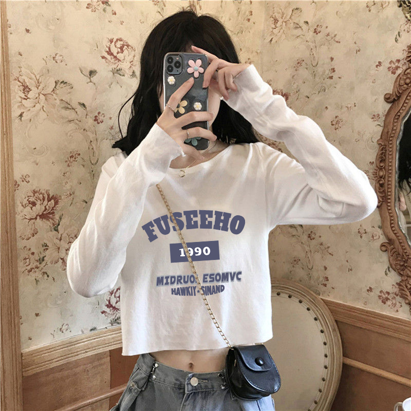 宽松白色ins上衣打底衫 辣妹高腰短款 春秋季 T恤女新款 圆领纯棉长袖