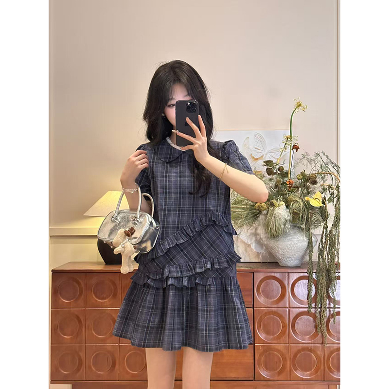 A字裙子潮大码 女装 胖mm 连衣裙女欧洲站2025新款 木耳边格子泡泡袖