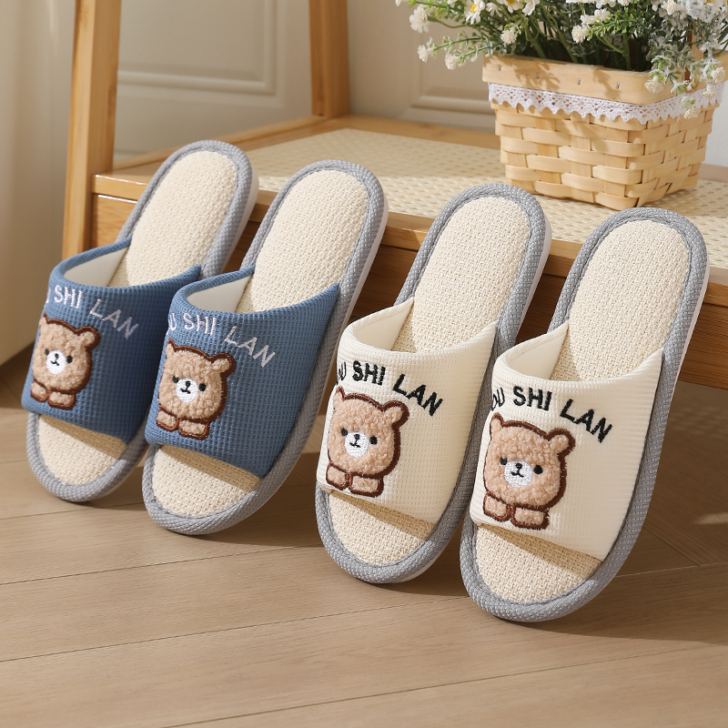 拖鞋 卡通亚麻办公室吸汗透气布底 女春秋棉麻居家室内可爱地板四季