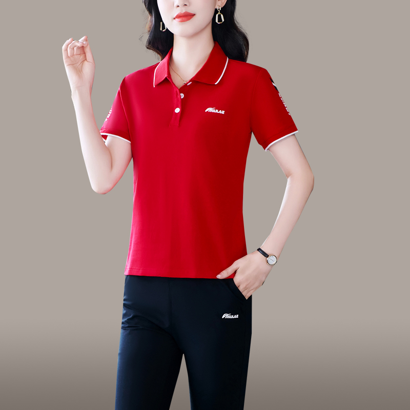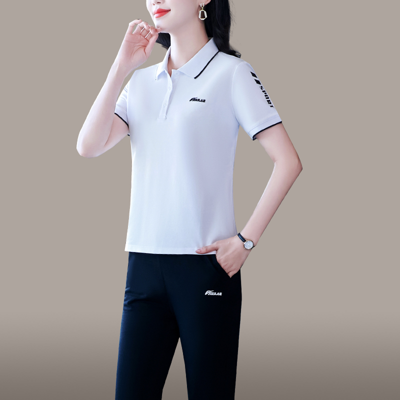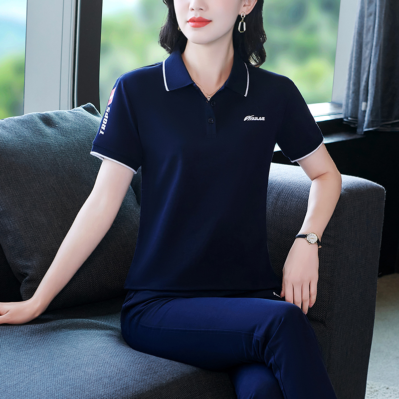 时尚 运动套装 长裤 短袖 洋气妈妈翻领T恤上衣中年休闲两件套 女夏季