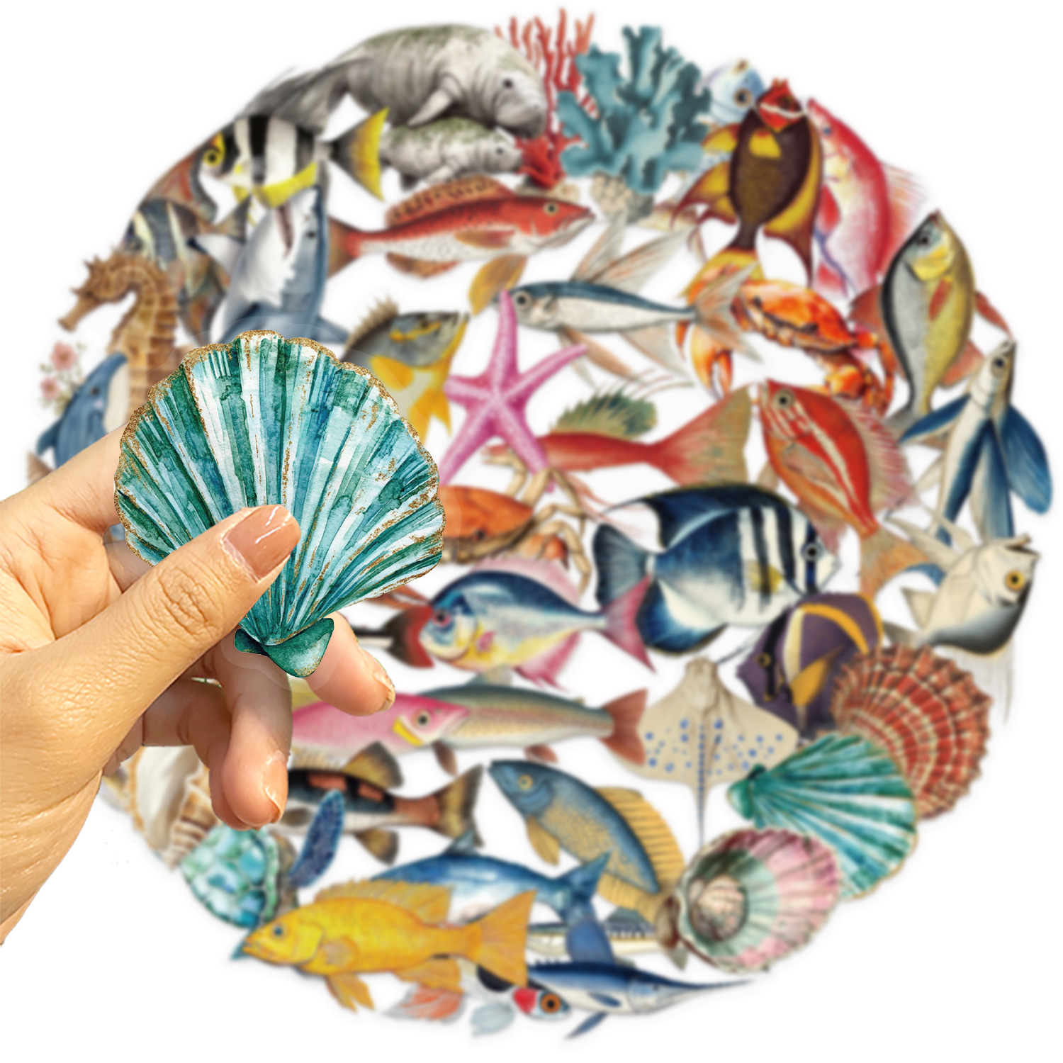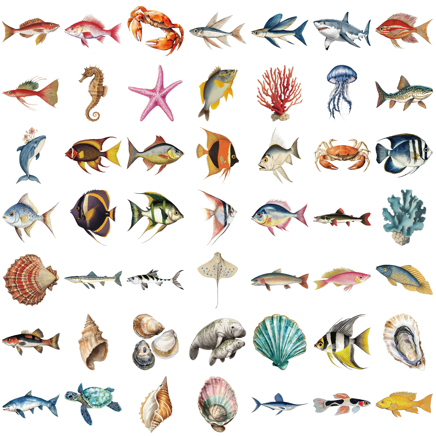 50张新款 饰浴室玻璃鱼缸镜子笔记本电脑平板吉他水杯DIY手机壳PET贴画防水 透明无白边海洋生物贴纸儿童认知装