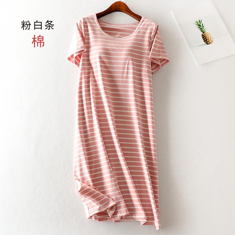 夏天夏款 长款 纯棉短袖 大码 条纹休闲可外穿 薄款 睡裙女睡衣裙子夏季