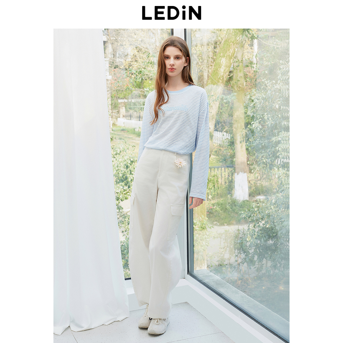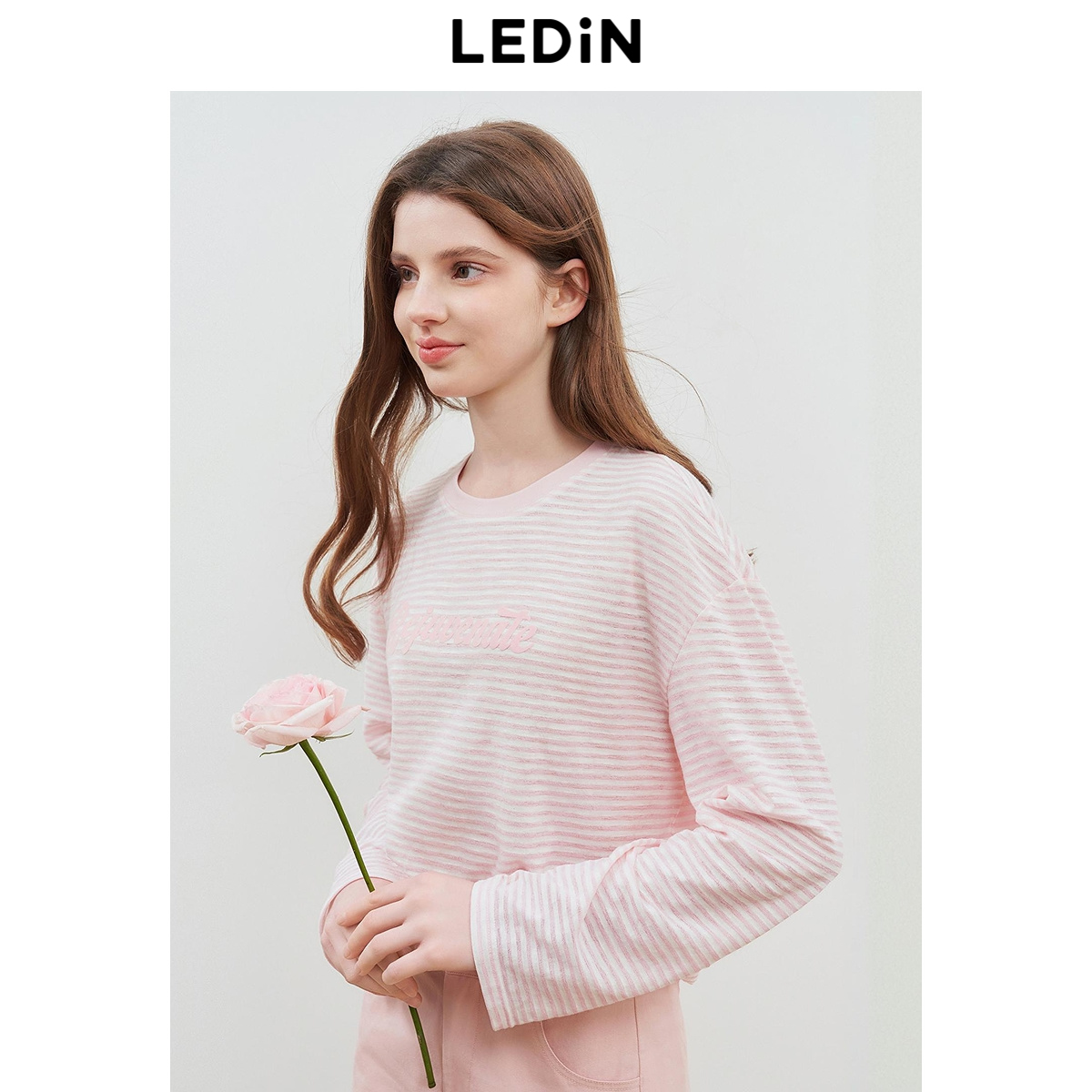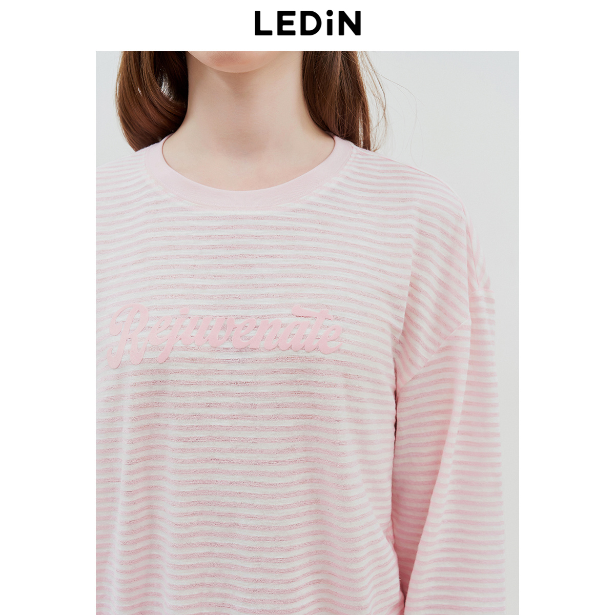 T恤 韩系清甜撞色条纹宽松落肩圆领植绒印花长袖 乐町2025春季 新款