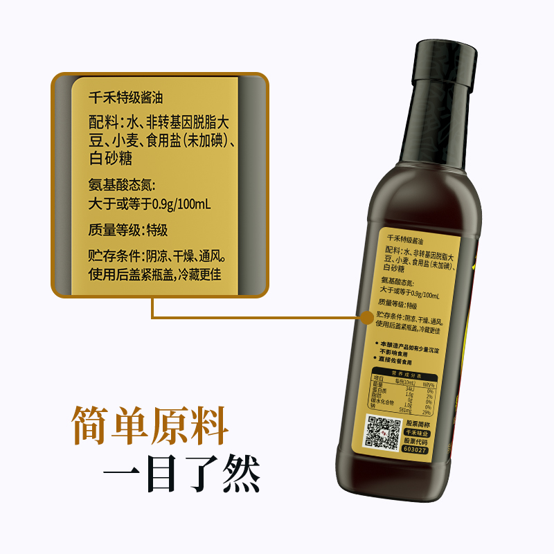千禾0零添加粮食酿造特级酱油500ml无添加剂家用炒菜佐餐调料生抽