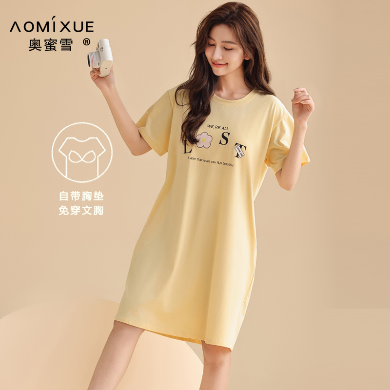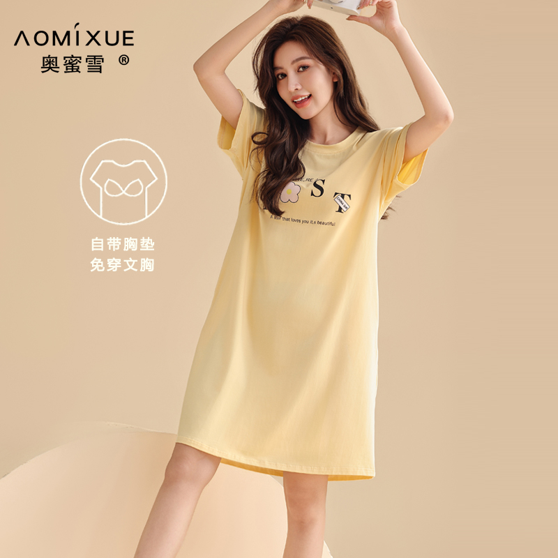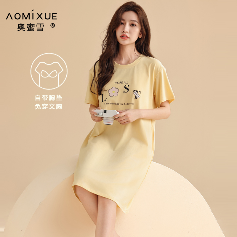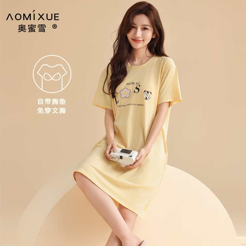 猫人棉绸睡裙女带胸垫夏季 莫代尔家居服 凉感简约甜美冰丝睡衣短袖