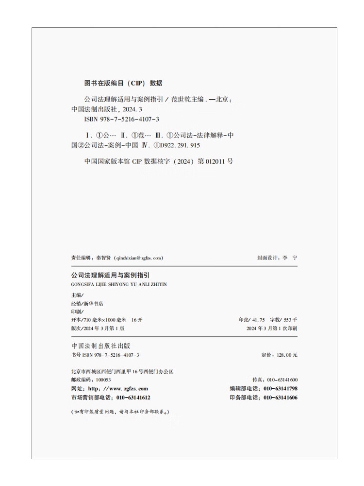 公司法理解适用与案例指引 社 范世乾 中国法制出版 9787521641073 主编 2024新书