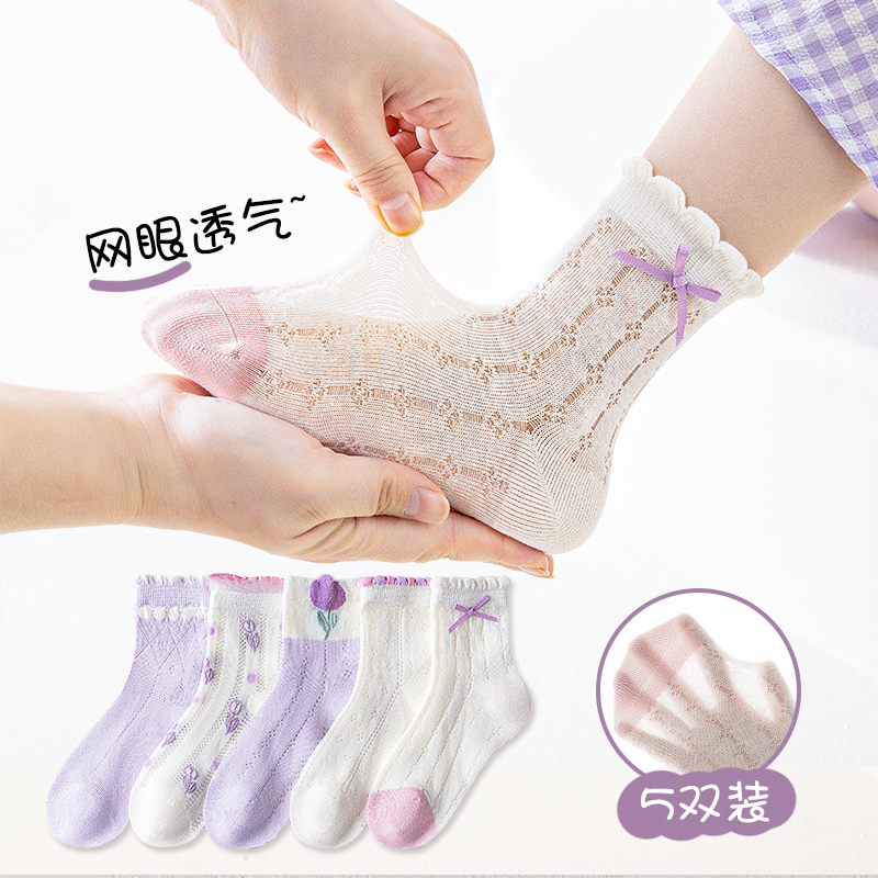 纯棉儿童袜子夏季 女童无骨中筒袜网眼可爱女孩花朵透气花边袜 薄款
