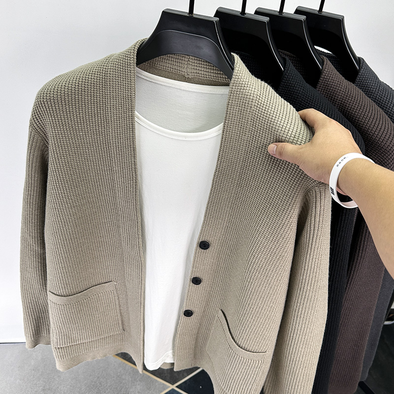 男士 秋冬季 纯色休闲口袋毛衣外套男外穿披肩 男针织衫 高端V领开衫