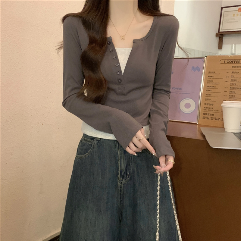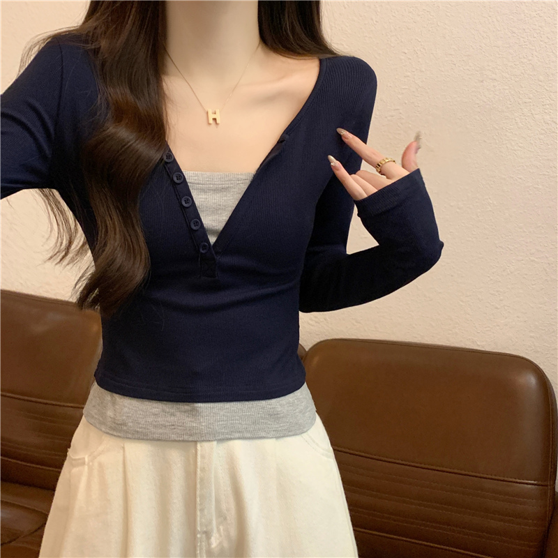 内搭打底衫 早春秋撞色假两件t恤女长袖 显瘦短款 修身 上衣 2025新款