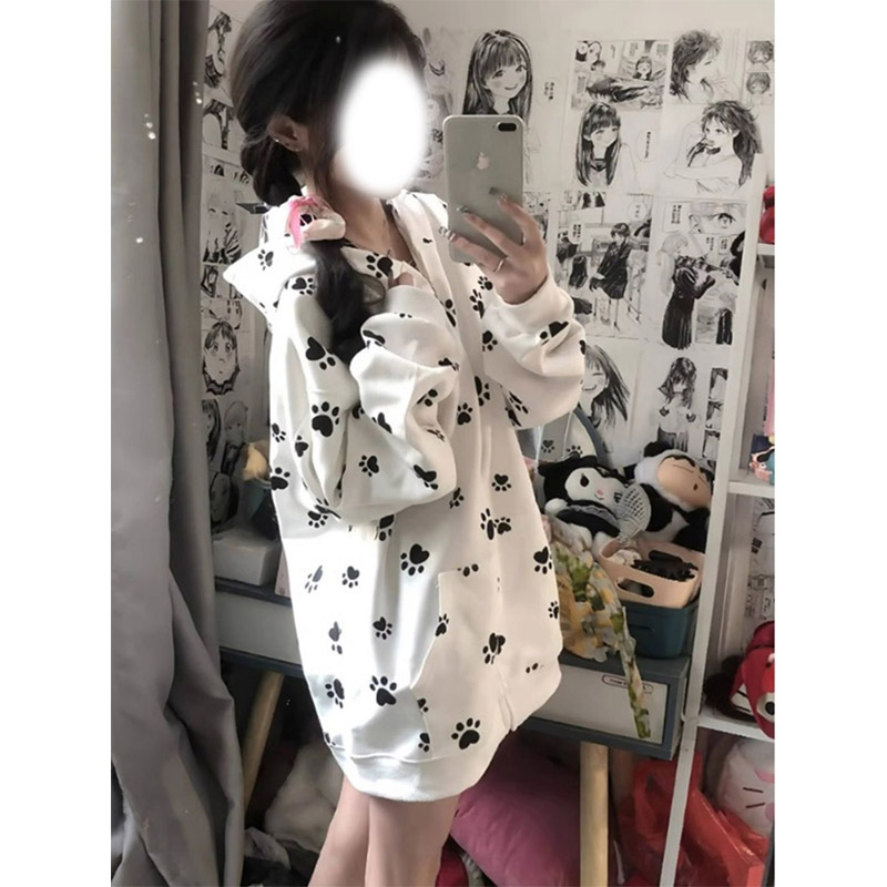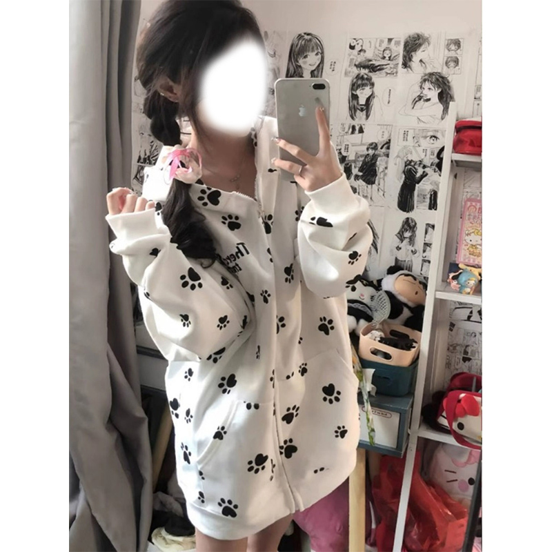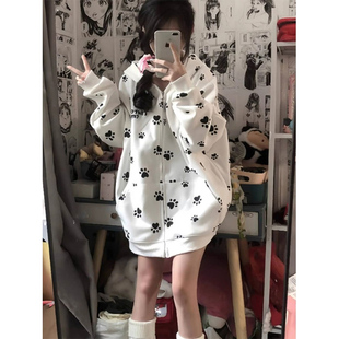 开衫 宽松休闲情侣装 外套上衣潮 甜酷猫爪爪印花连帽卫衣女秋季 美式