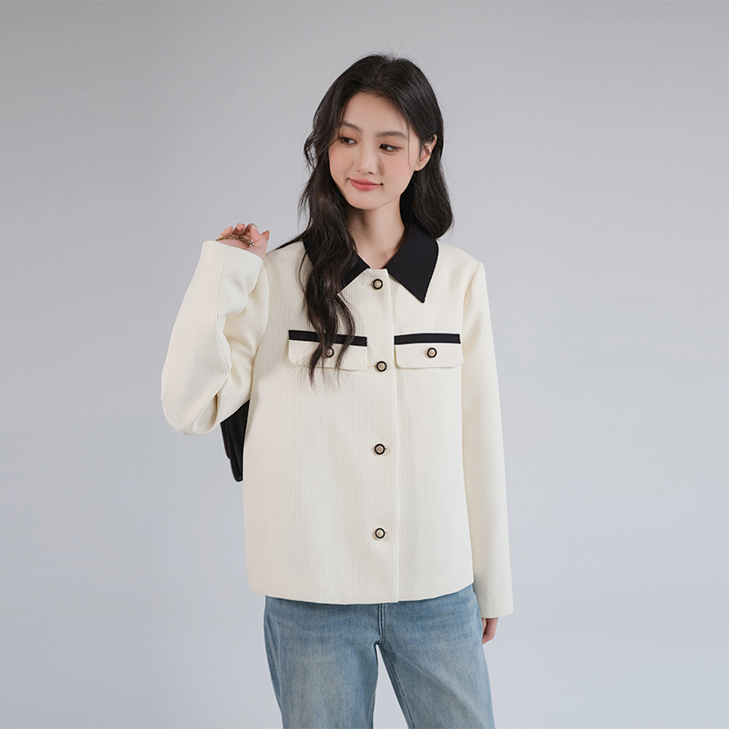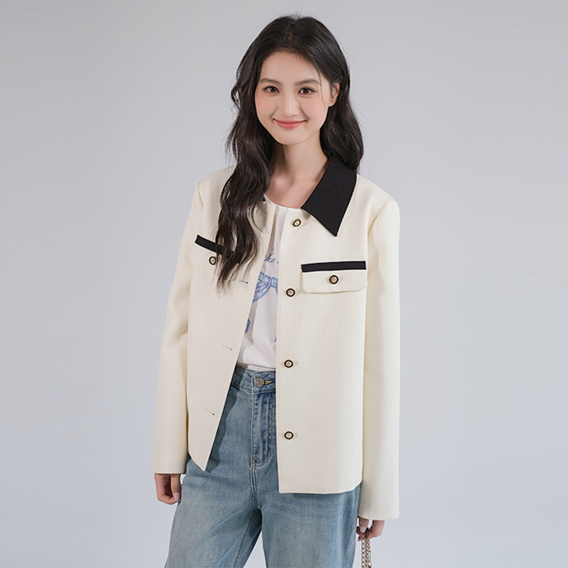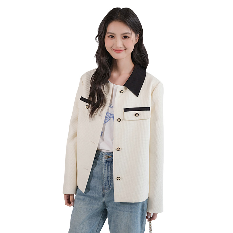 小香风华夫格外套 新款 蓝若水大码 秋装 撞色翻领高级感上衣 女装