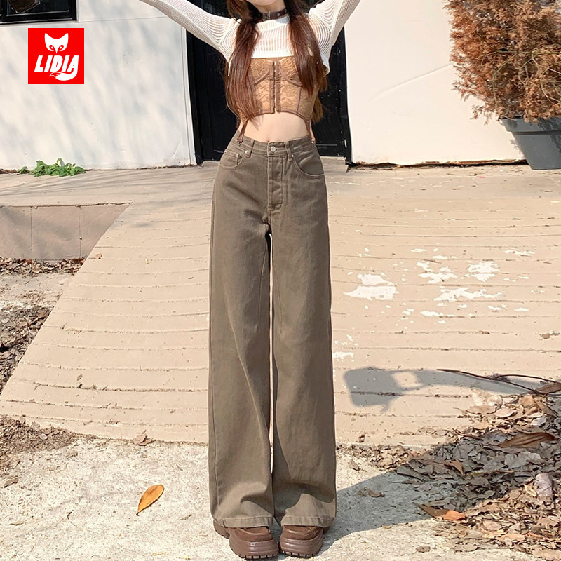 子宽高腰显瘦松直筒拖地裤 深卡其阔腿牛仔裤 复古裤 美式 女秋冬新款