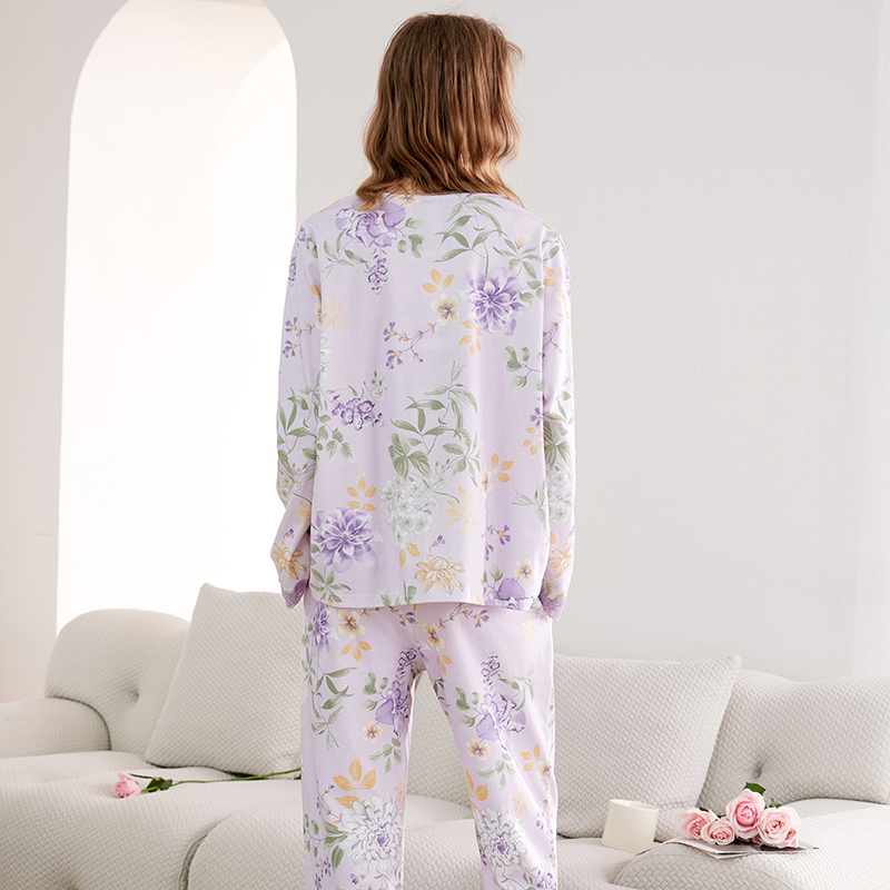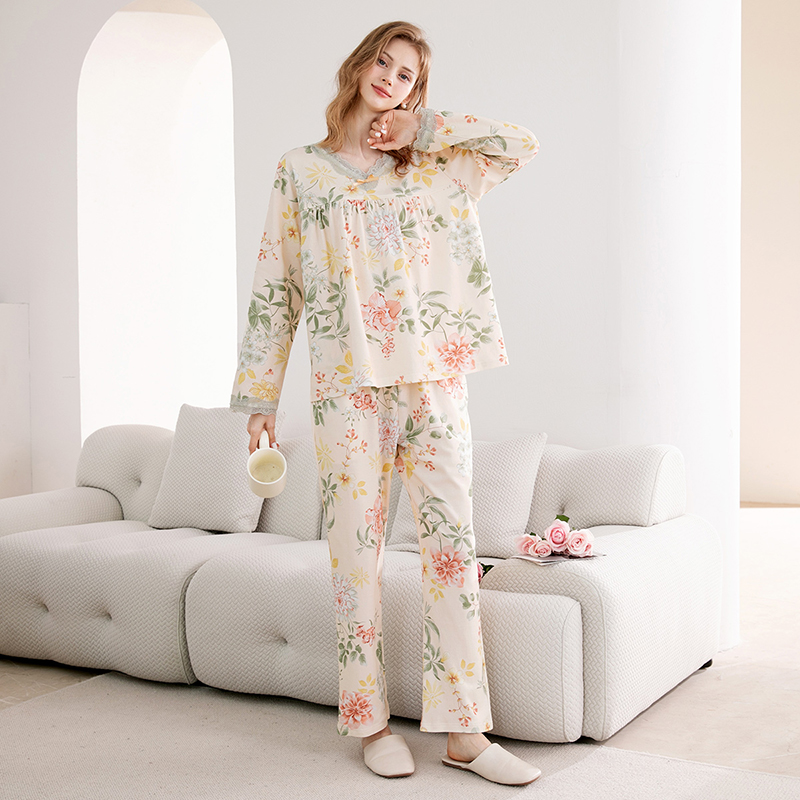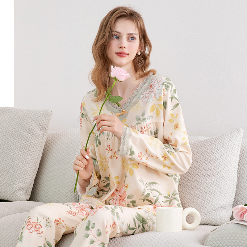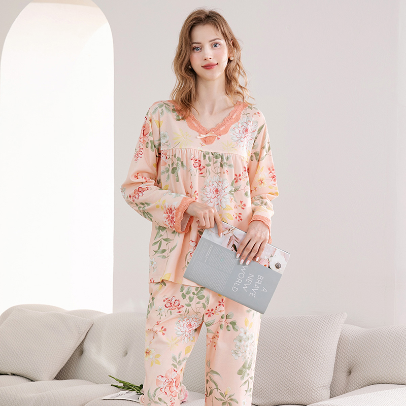 长袖 全棉大码 套装 女款 家居服 简约休闲秋季 芬腾春秋睡衣女纯棉开衫