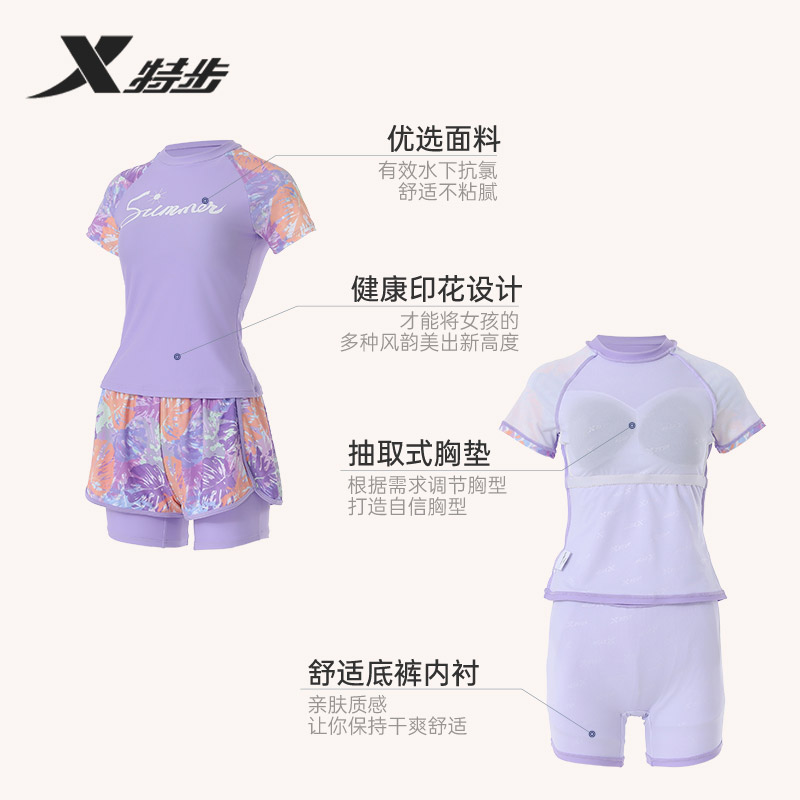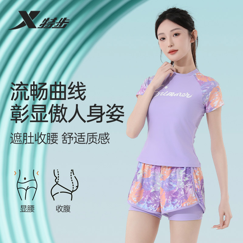 女孩温泉泳装 速干保守分体平角遮肚显瘦大码 2025新款 特步泳衣女款