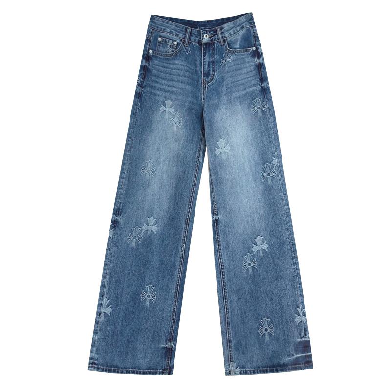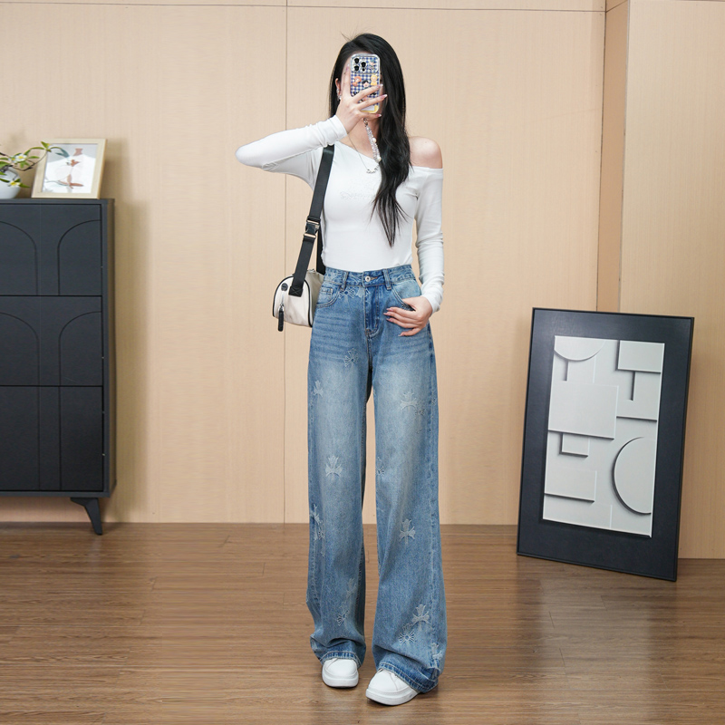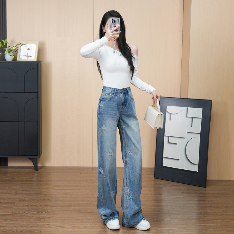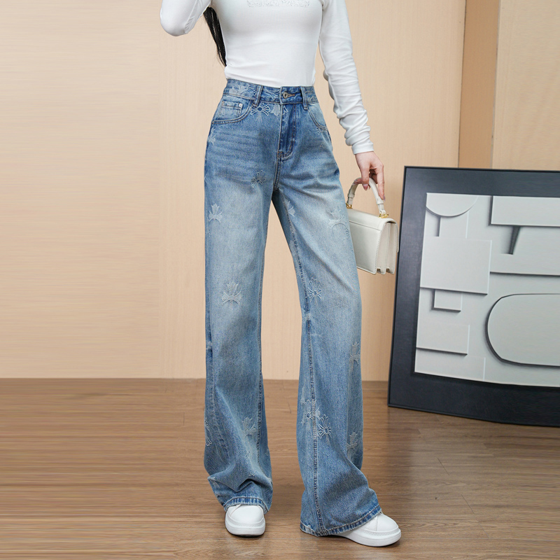 直筒牛仔裤 高腰宽松显瘦阔腿长裤 女秋季 爆款 2025新款 复古刺绣窄版