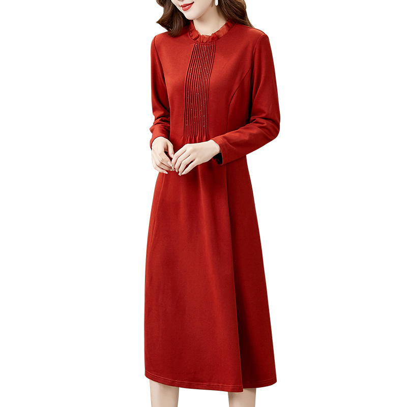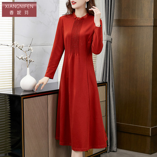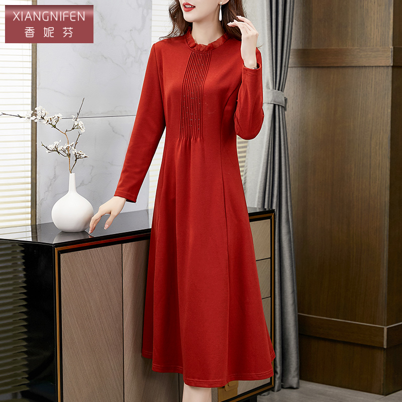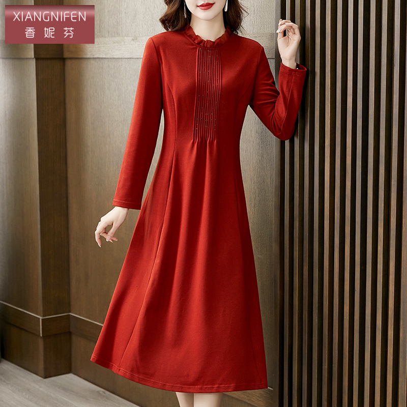 2025春秋冬纯色大红色连衣裙收腰显瘦长裙妈妈款 小个子沙滩裙 短款