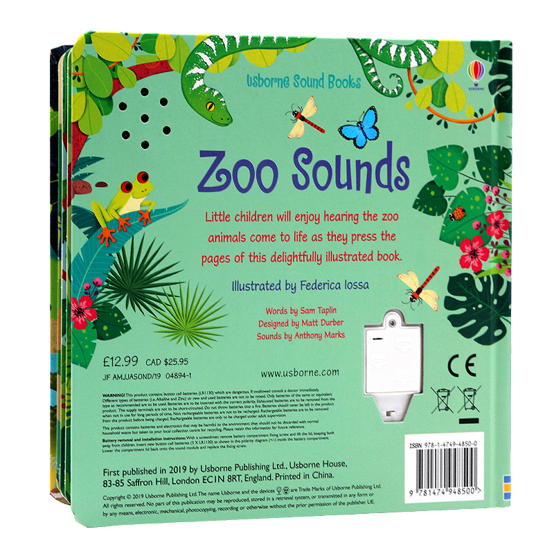 英文原版 Sound 幼儿英文启蒙认知单词故事绘本纸板书 出品 触摸感知洞洞书 Sounds 动物园奇趣发声书 Zoo Usborne Books