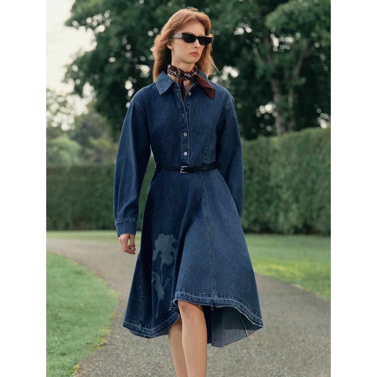 ELLE法式 设计感纯棉别致裙子 牛仔蓝鸢尾花翻领连衣裙女2025秋新款