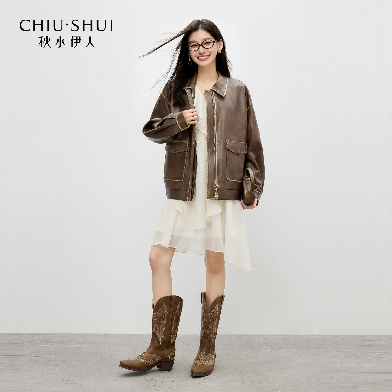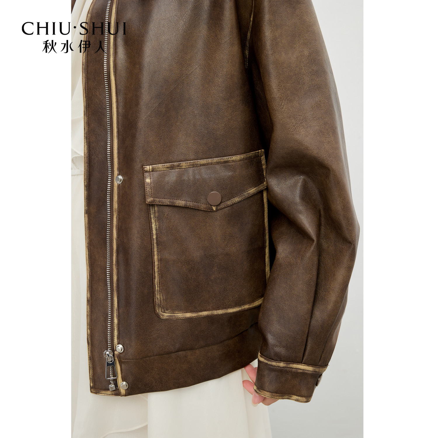 秋水伊人棕色皮衣外套女夹克2025秋季 超火酷飒风百搭翻领上衣 新款