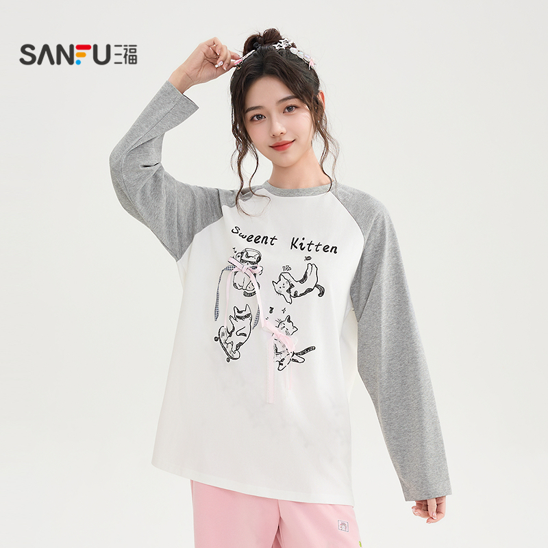 508616 上衣女装 三福长T恤2025秋季 蝴蝶结小猫印花插肩袖