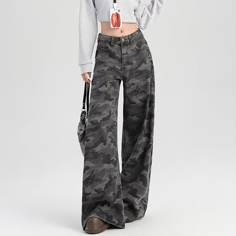 胖mm宽松直筒裤 美式 女垂感大码 阔腿迷彩牛仔裤 子梨型休闲灰色 工装