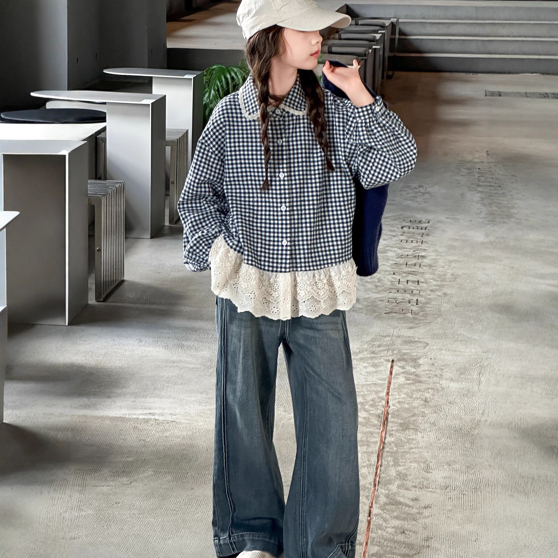 儿童牛仔阔腿裤 女童春秋套装 韩系马甲衬衫 大童秋装 三件套 2025新款