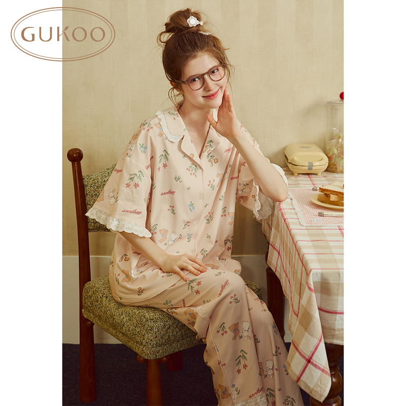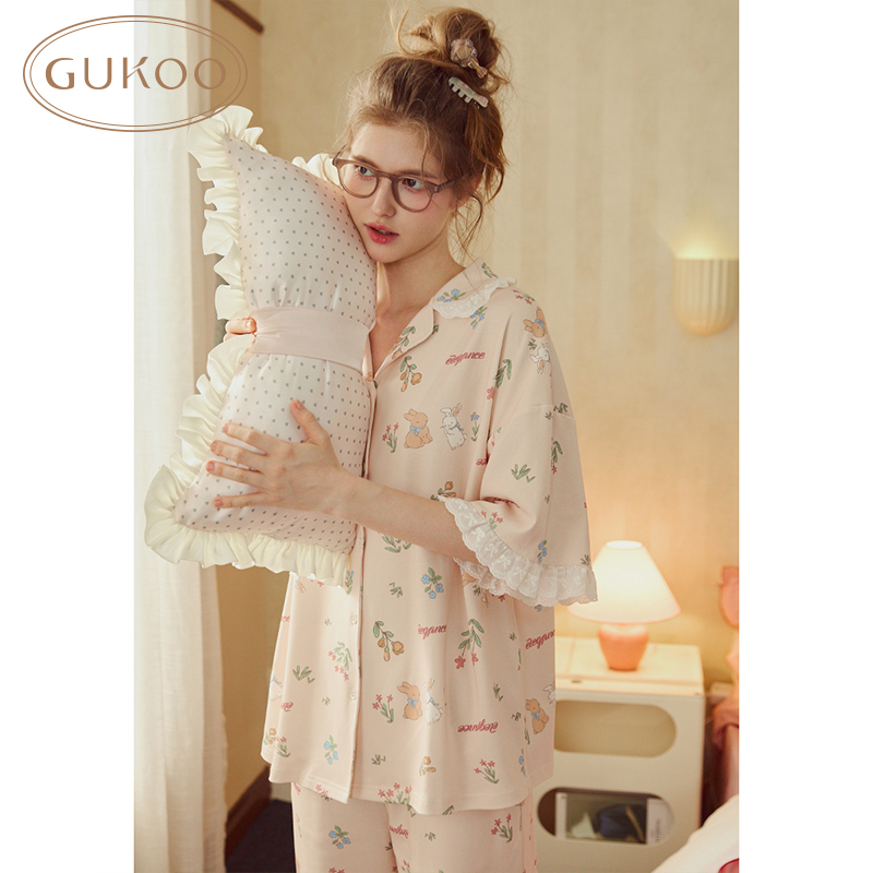 简约女士家居服套装 宽松新款 果壳冰丝睡衣女春秋款 Gukoo