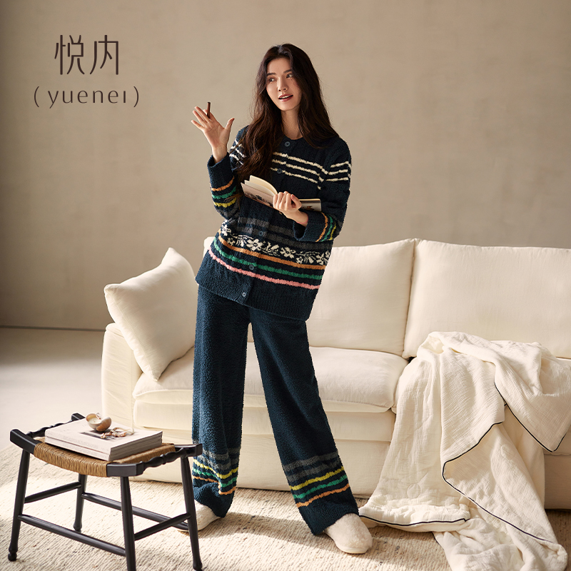 悦内半边绒睡衣女秋冬季 珊瑚绒保暖毛绒家居服复古麻花费尔岛 冬款