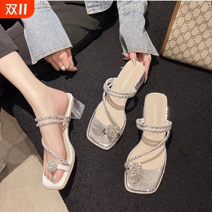 其他拖鞋 2025高跟鞋 不累脚粗跟气质水晶凉拖鞋 凉鞋 女夏外穿法式