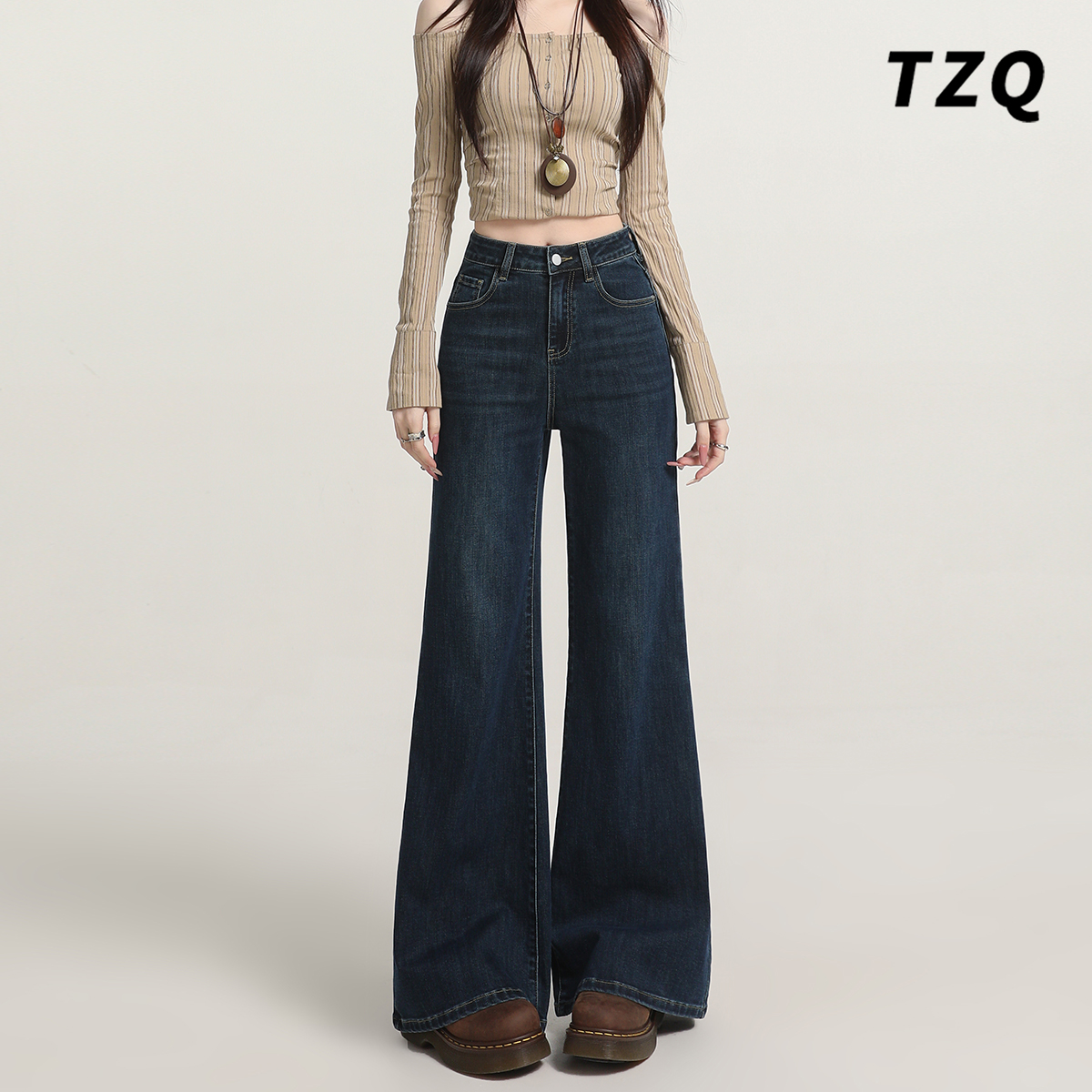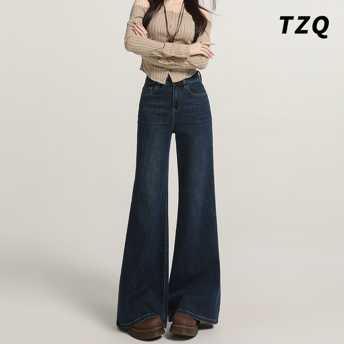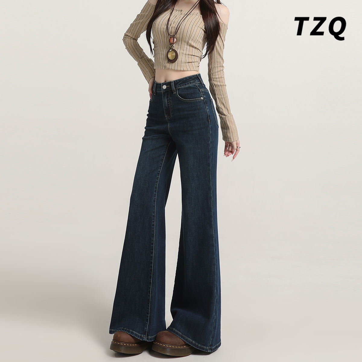 深蓝色高腰加绒显瘦喇叭裤 不贴腿微喇牛仔裤 女秋季 时尚 子 新款 美式