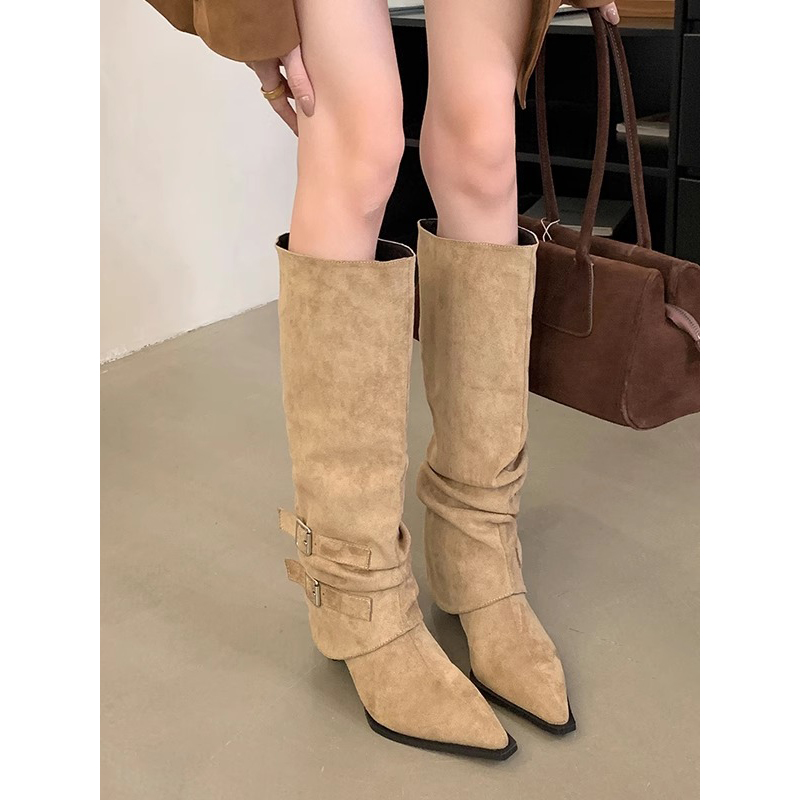 绒面尖头褶皱堆堆靴女2025秋冬新款 可拆卸两穿细跟长筒靴高跟短靴