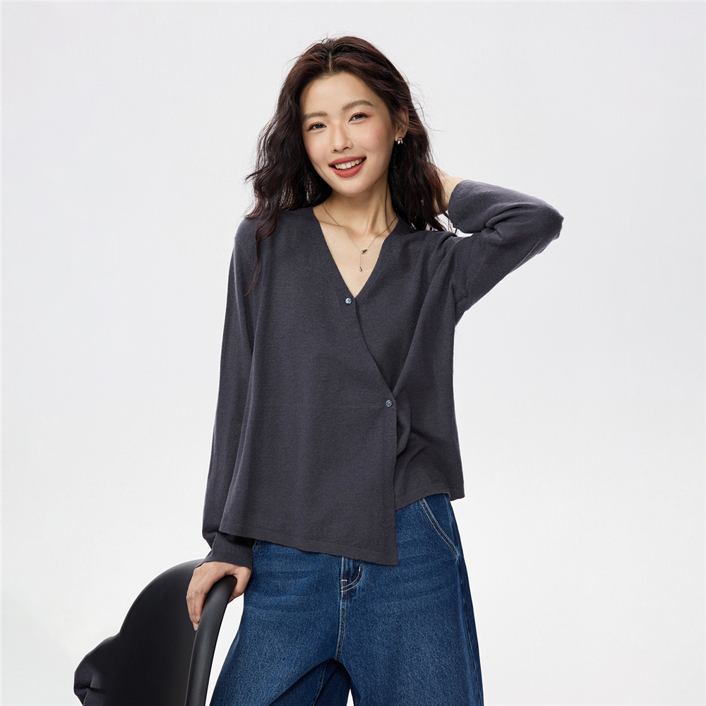 灰色圆领休闲针织衫 飞鸟和新酒刺绣时尚 新款 女2025秋季 毛衣开衫