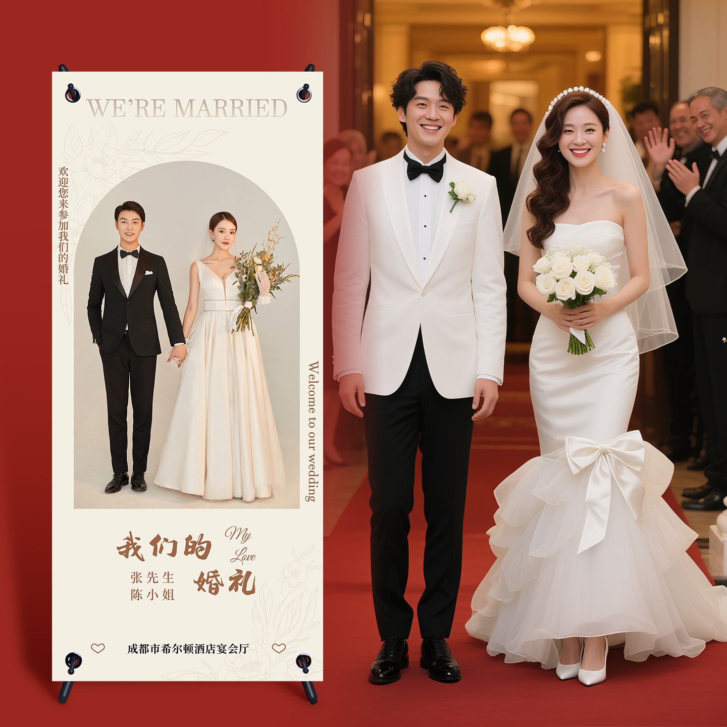 结婚海报定制婚礼迎宾布置装 饰加打印洗婚纱照片易拉宝指引牌制作