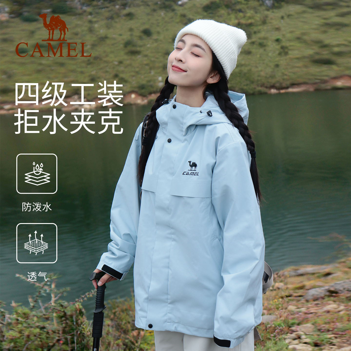 骆驼运动外套女秋季 黑色连帽风衣外套户外登山防水防风薄绒夹克男