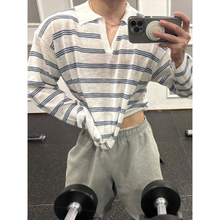 内搭打底针织上衣 t恤男生秋慵懒松弛感运动罩衫 V领条纹Polo衫 长袖