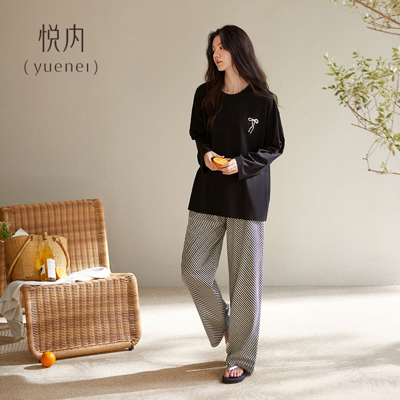 家居服休闲条纹圆领套头可外穿出门 纯棉长袖 悦内睡衣女春秋款 秋季