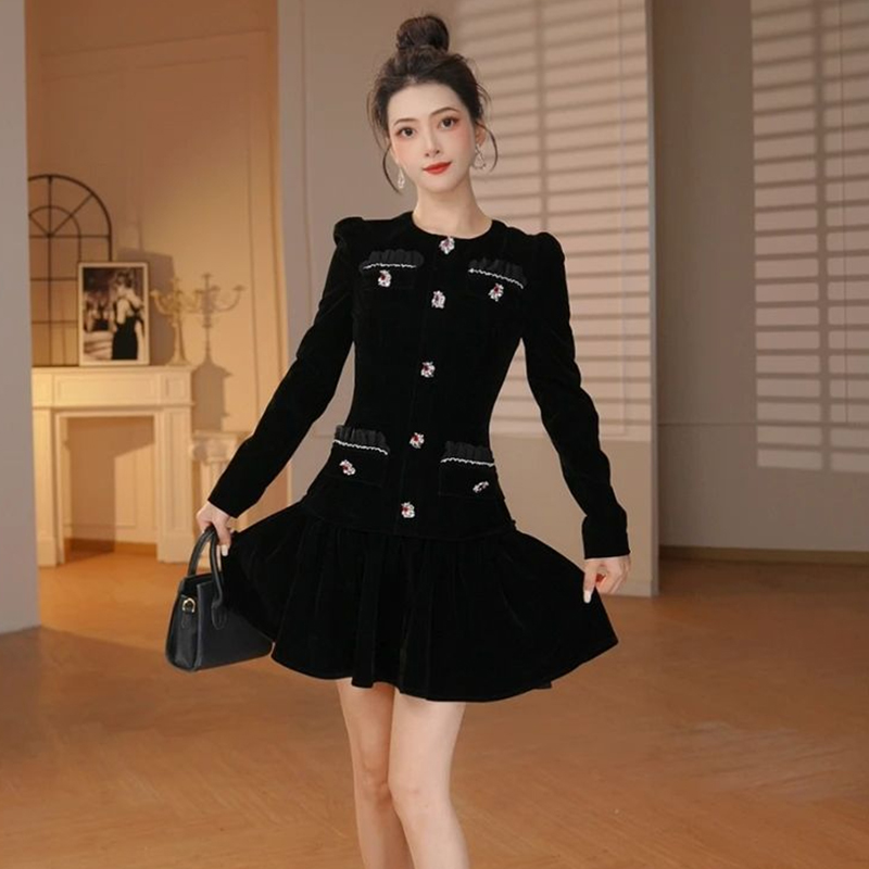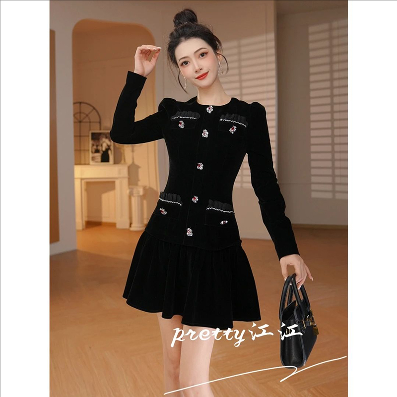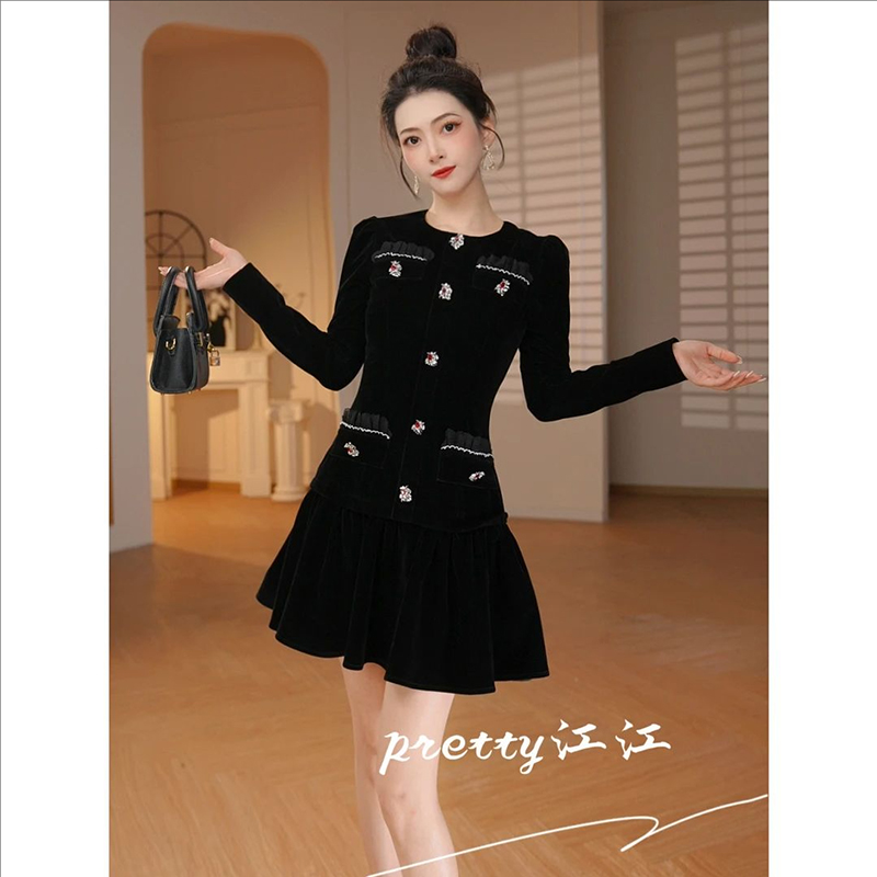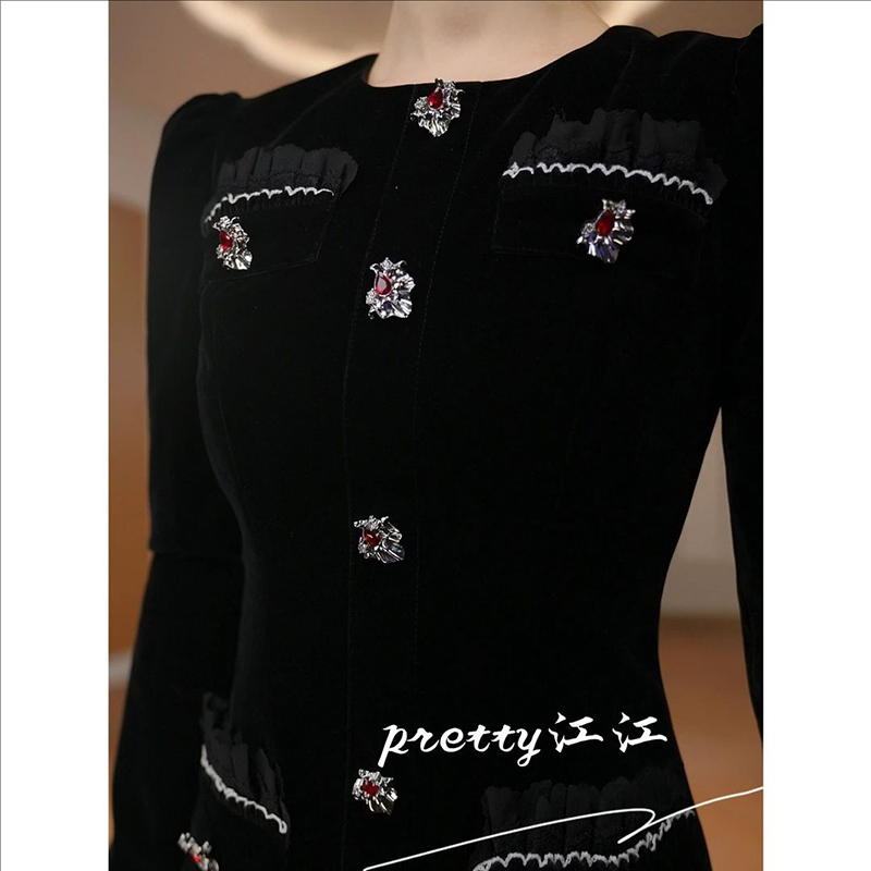 小个子高腰显瘦宫廷风丝绒连衣裙女名媛气质高级感重工长袖 小黑裙