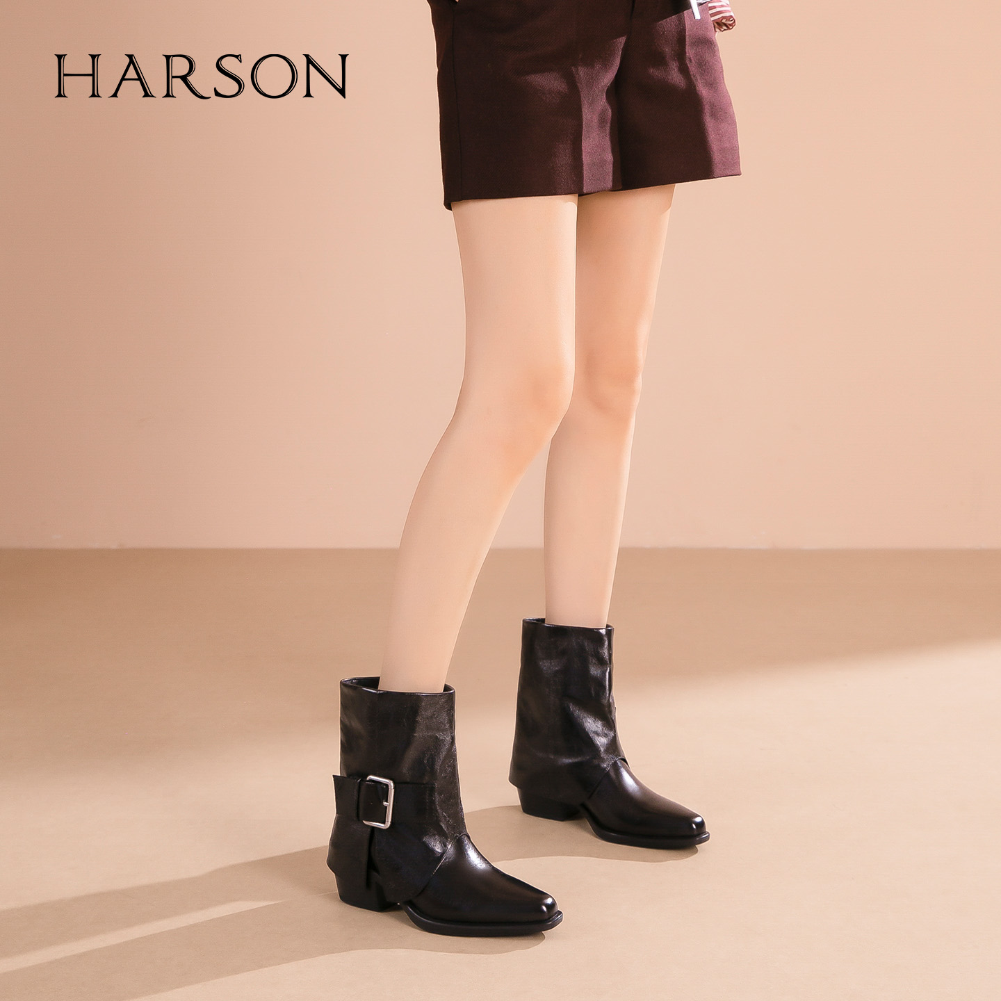 HWA250136 靴女中靴2025冬新款 哈森气质方头裤 管靴真皮粗高跟时装