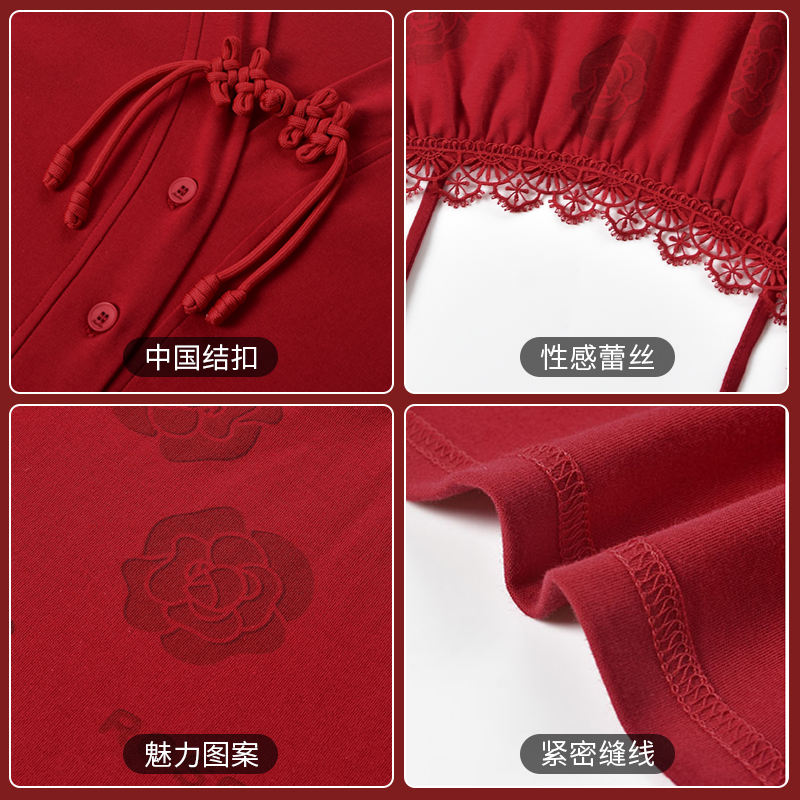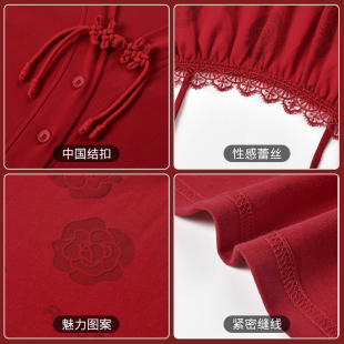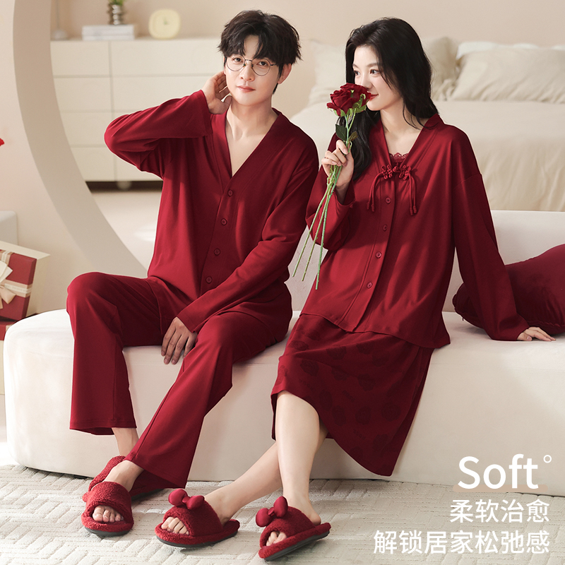 男 睡裙女2件套结婚家居服套装 猫人红色睡衣情侣秋冬纯棉长袖 开衫