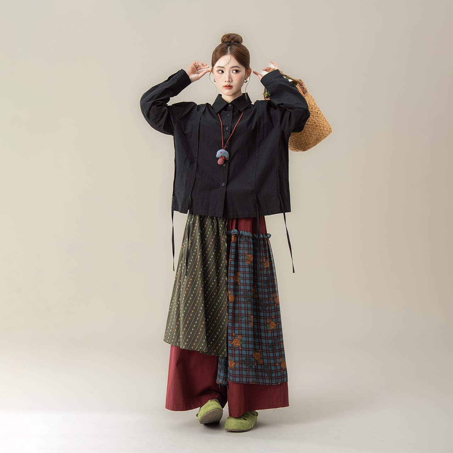 女秋 纯棉不对称系带上衣宽松复古格子衬衫 RUISHI芮时 纸片人