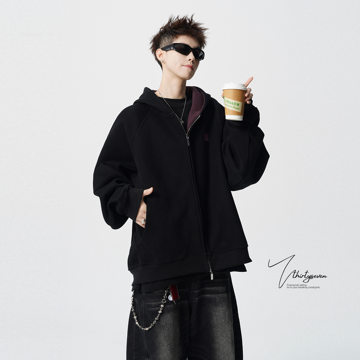 高街复古撞色宽松连帽开衫 卫衣男秋季 外套 解构拼接插肩袖 V37美式