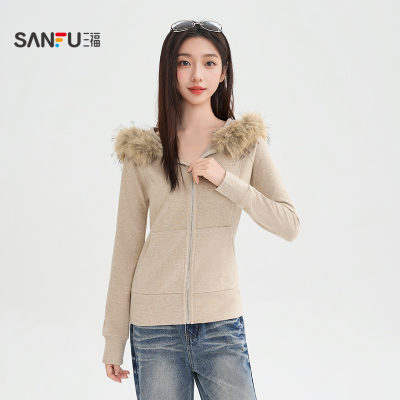秋冬新款 开衫 修身 收腰上衣早秋穿搭美式 短款 灰色连帽卫衣外套女款