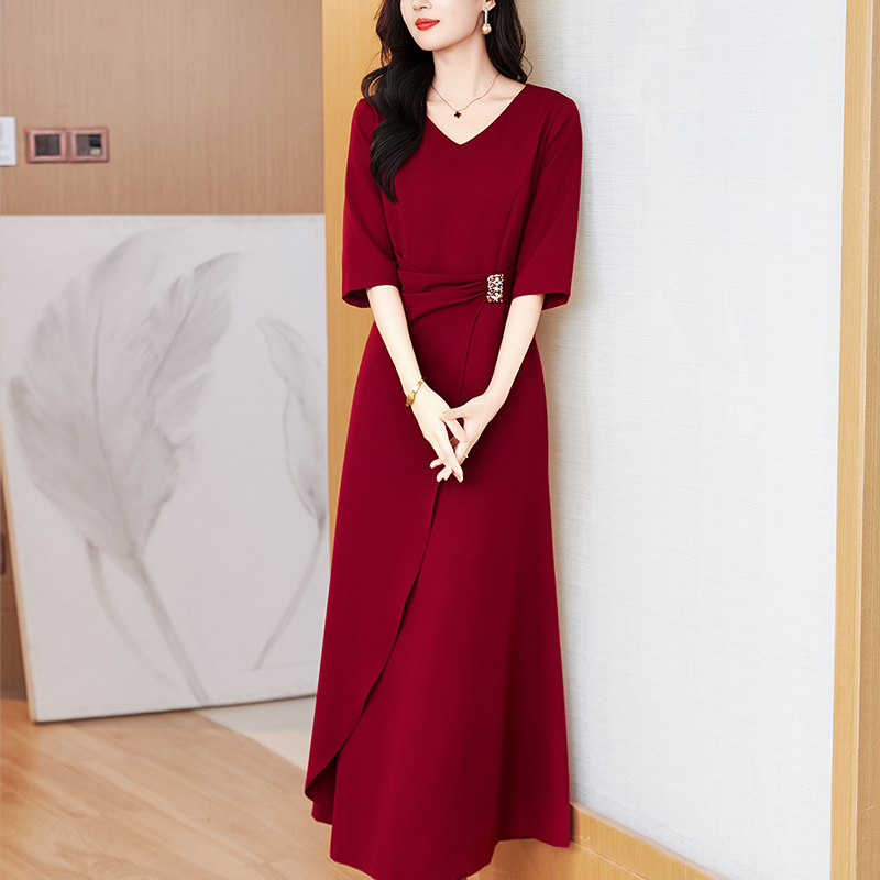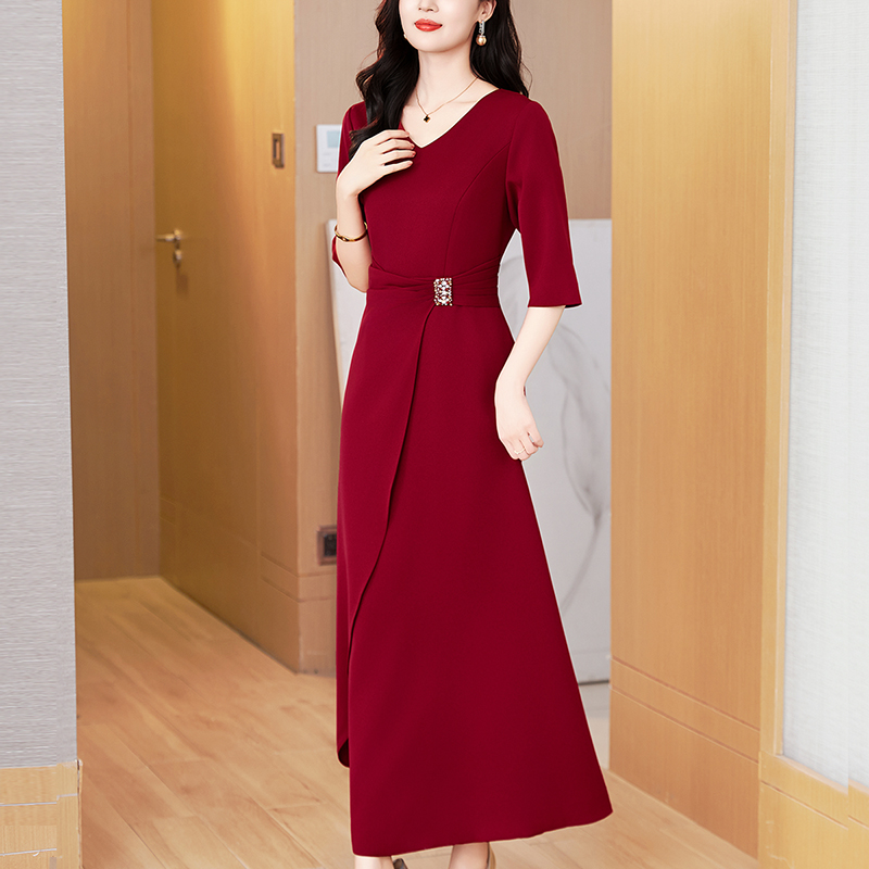 礼服长款 高端轻奢妈妈装 连衣裙女2025春秋新款 酒红色喜婆婆婚宴装