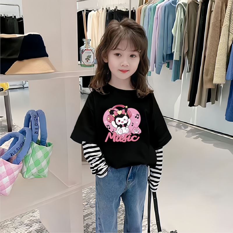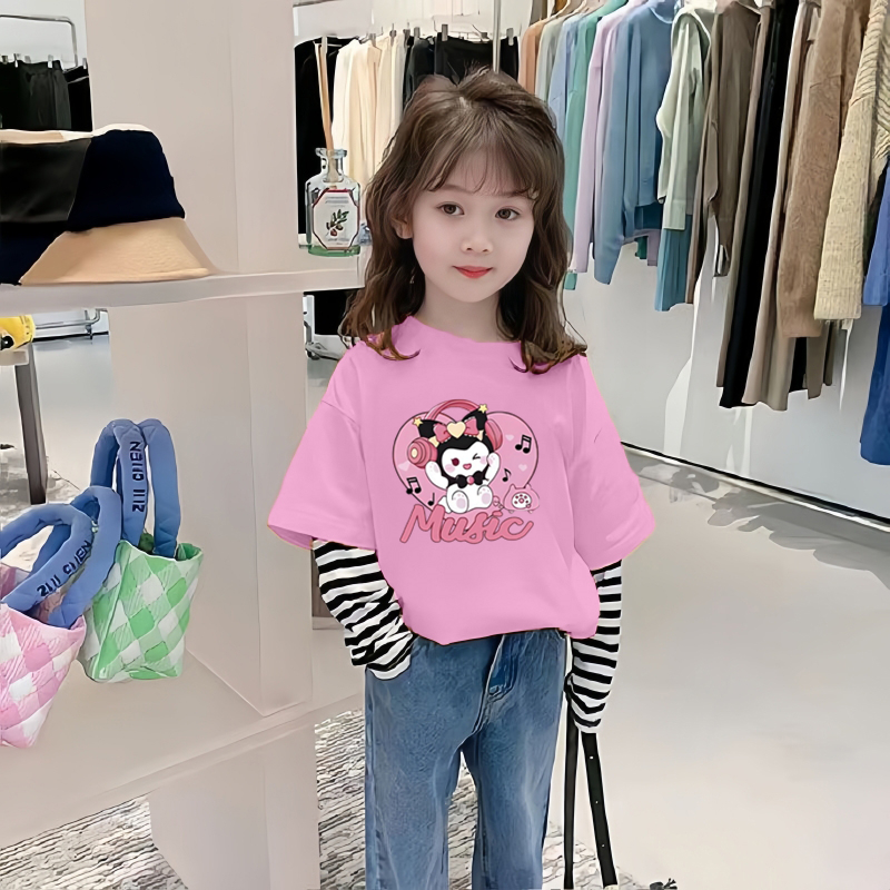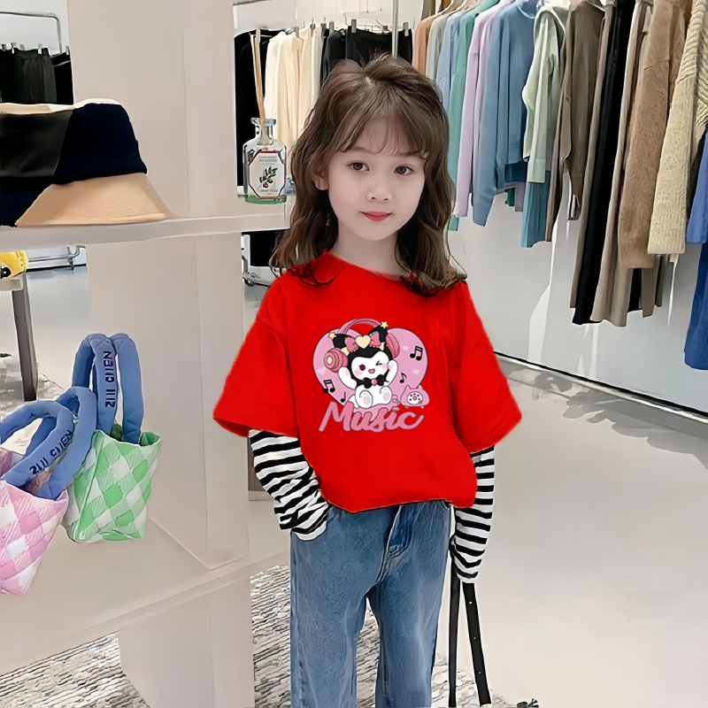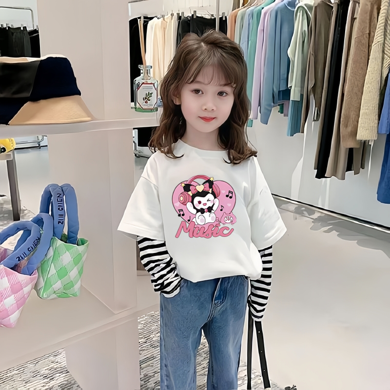 T恤儿童假两件上衣 女宝宝洋气库洛米长袖 女童春秋纯棉打底衫 新款