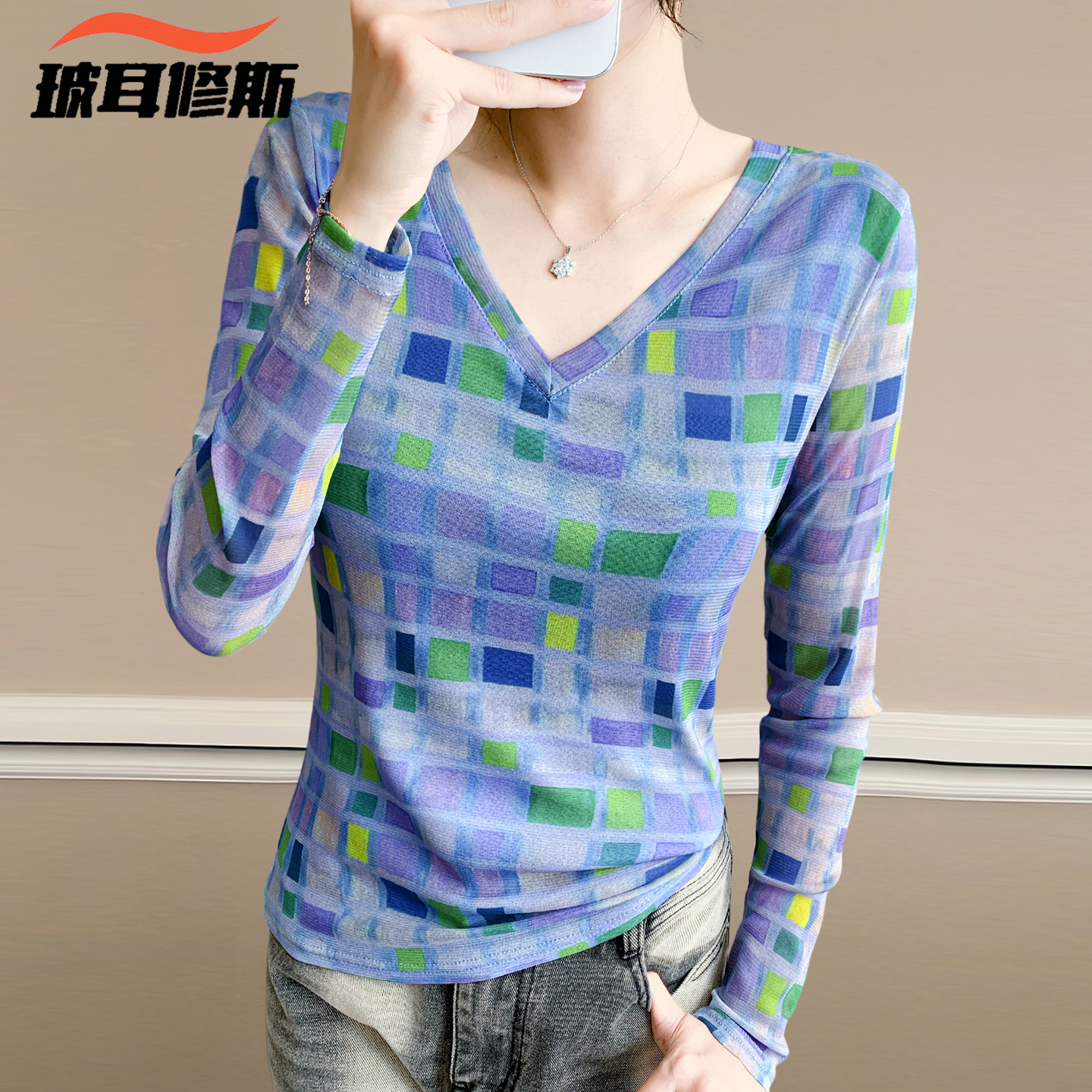 上衣女士大码 洋气打底衫 百搭显瘦蕾丝t恤 印花秋冬新款 V领网纱长袖