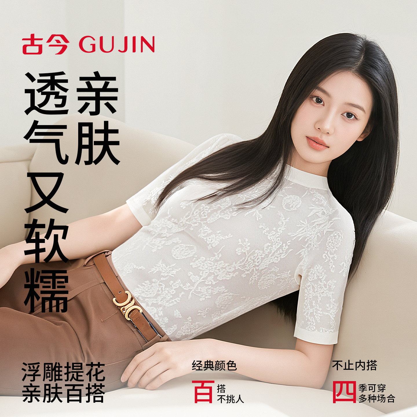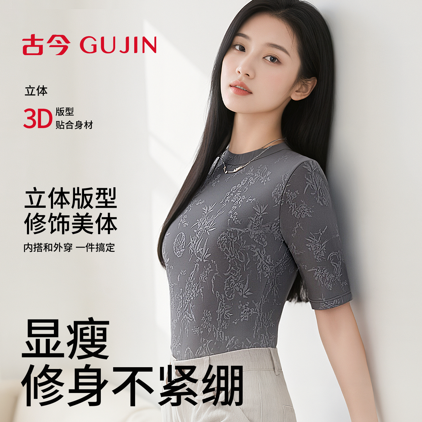 2025新款 古今半高领打底衫 t恤内搭黑色五分短袖 上衣女修身 秋 中袖