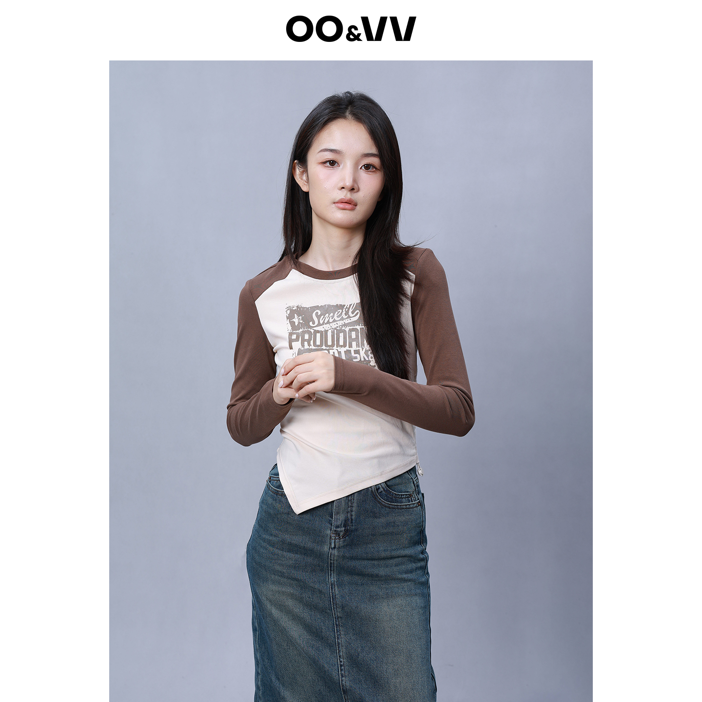 高腰打底衫 t恤女不规则修身 撞色字母印花插肩长袖 oo&vv2025秋新款