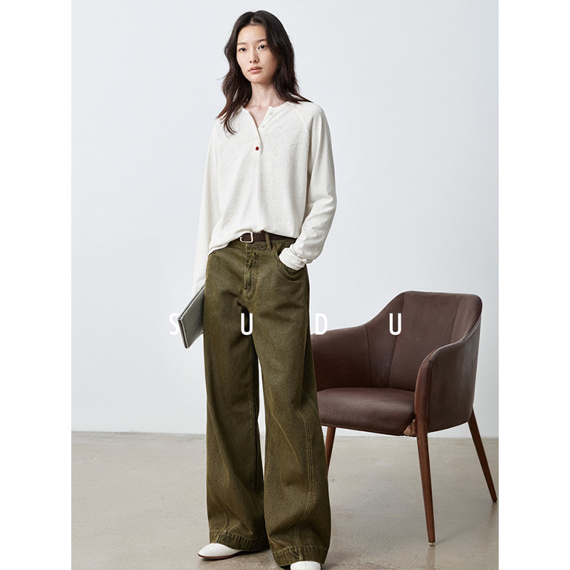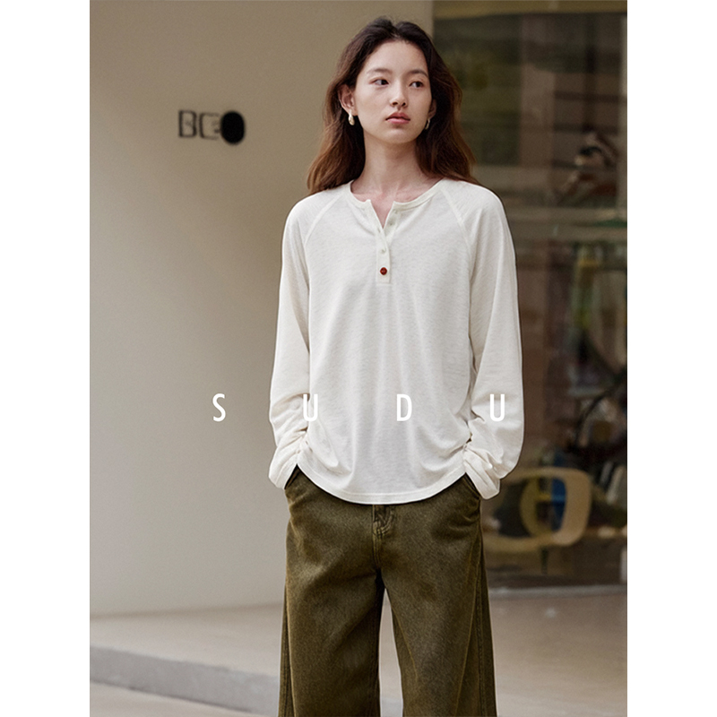 t恤女肌理感亮色纽扣点缀休闲上衣 亨利领长袖 SUDU素都秋季 插肩袖